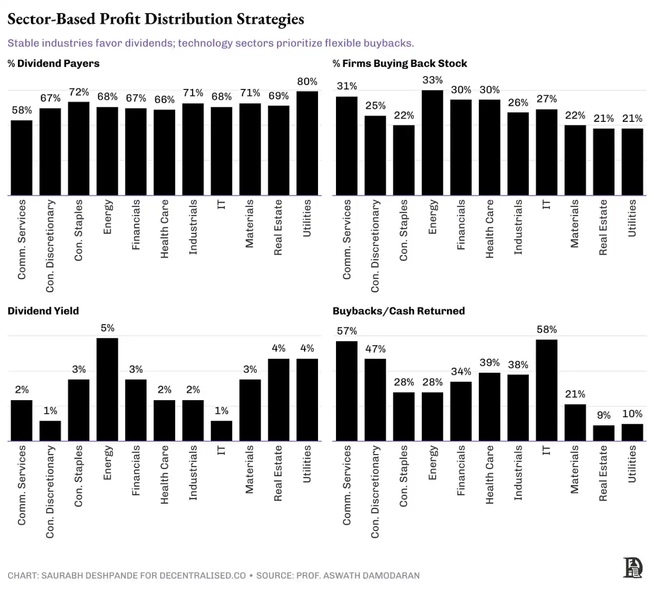 公司年龄与利润分享策略之间的关系自然延伸到特定行业的实践中。虽然年轻公司通常优先考虑再投资,但成熟公司会根据所处行业的特点调整策略。现金流稳定、丰富的行业倾向于可预测的股息,而以创新和波动为特征的行业则更喜欢股票回购带来的灵活性。理解这些细微差别有助于加密项目创始人有效调整收入分配策略,使项目的生命周期阶段和行业特点与投资者期望相匹配。