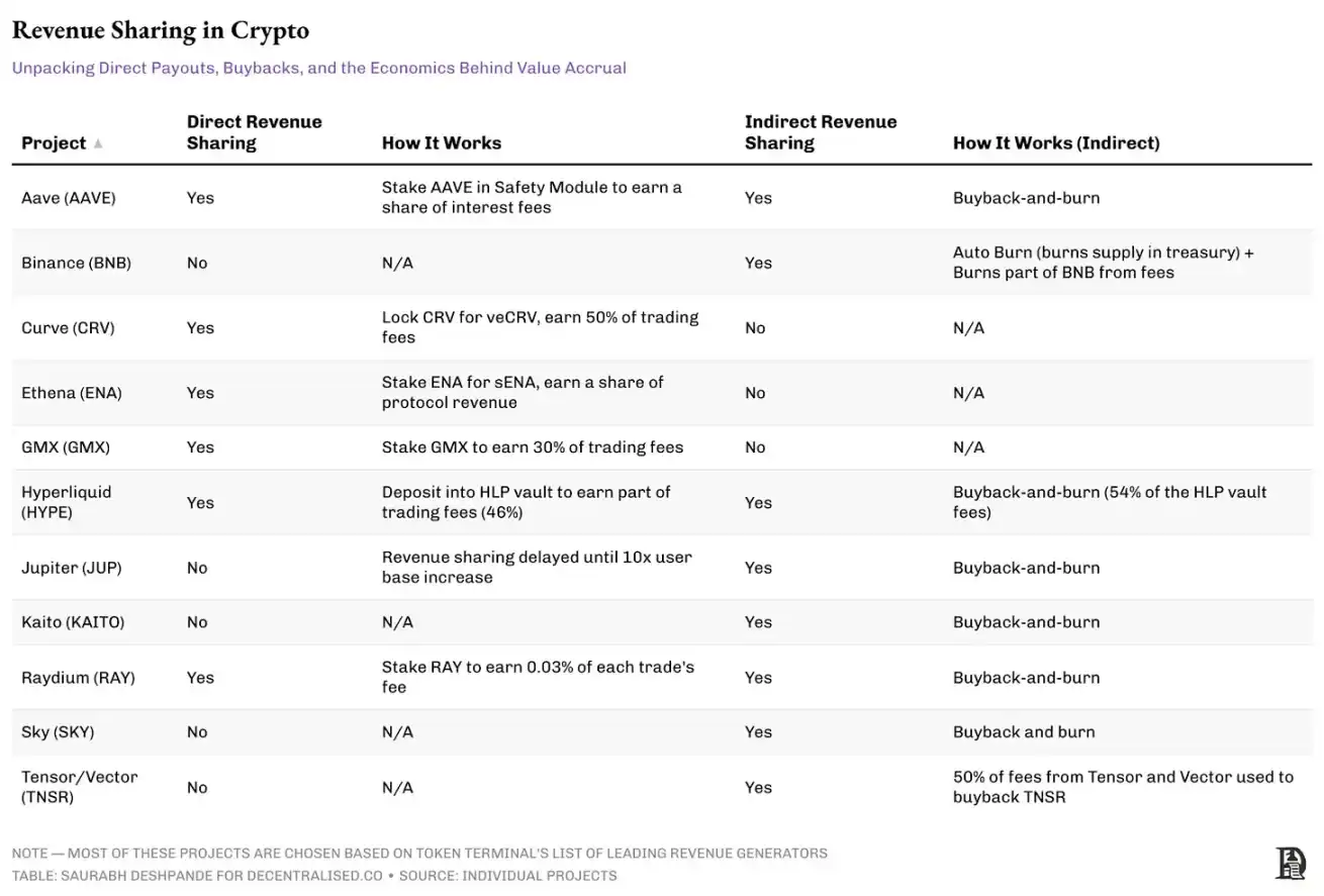 除了这些与代币整合的策略,一些项目采用更直接的收益分享方法,让人联想到传统的公开股权实践。然而,即使是直接收益分享模式,也必须谨慎操作,以避免被归类为证券,在奖励代币持有者与遵守监管规定之间保持平衡。像 Hyperliquid 这样在美国境外的项目,在采用收益分享做法时往往有更大的操作空间。