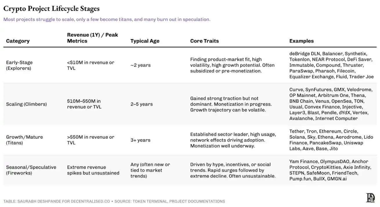 虽然有些项目可能在小众市场取得早期成功,但仍需证明其模式能否可持续。大多数加密初创项目都处于这一类别,只有一小部分能够突破向前。