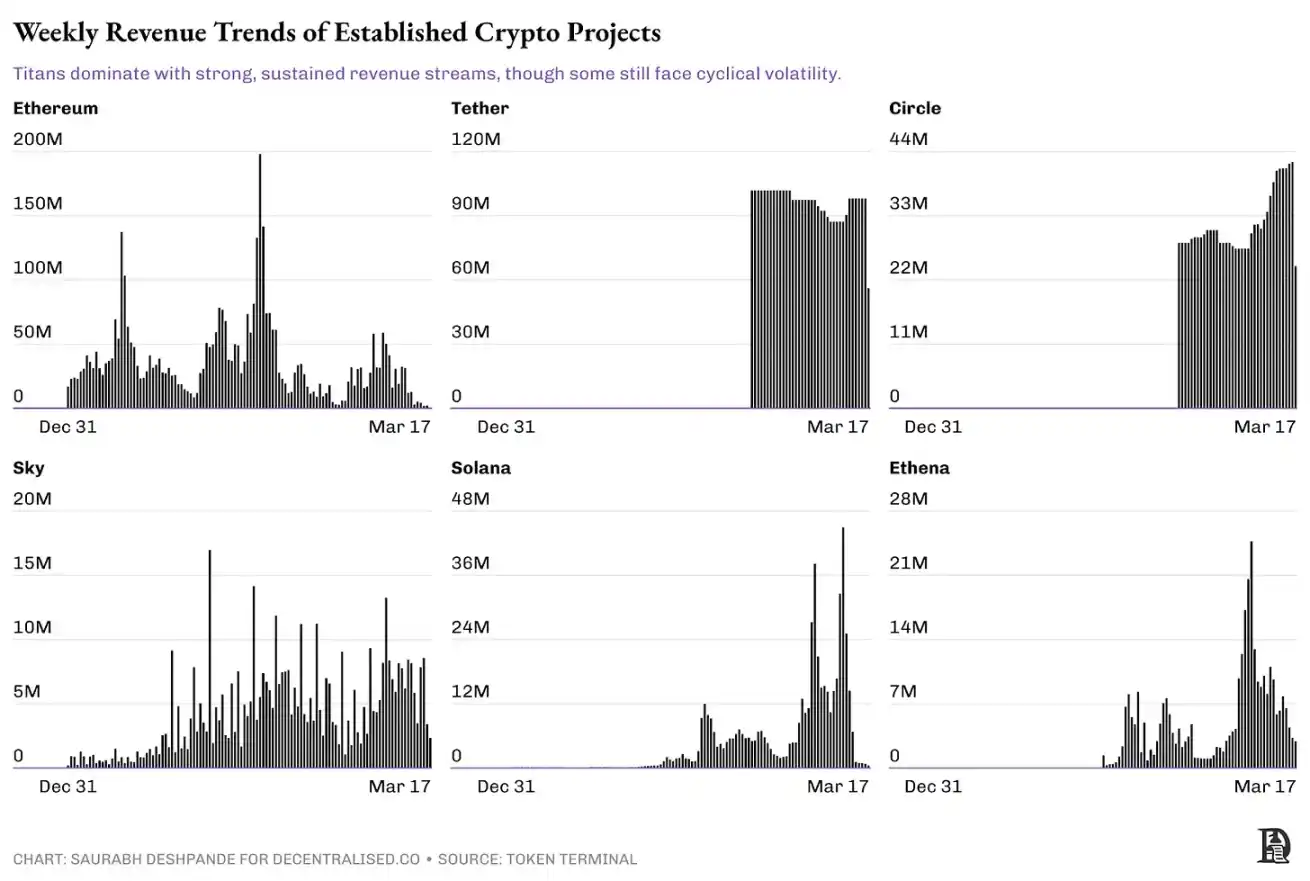 以太坊在去中心化收入生成方面处于领先地位,呈现出与网络高活动期相符的周期性高峰。Tether 和 Circle 这两大稳定币巨头的营收情况则有所不同,收入流更稳定、更结构化,而非大幅波动。Solana 和 Ethena 虽然营收可观,但仍存在明显的增长与回落周期,反映出它们不断变化的采用状况。