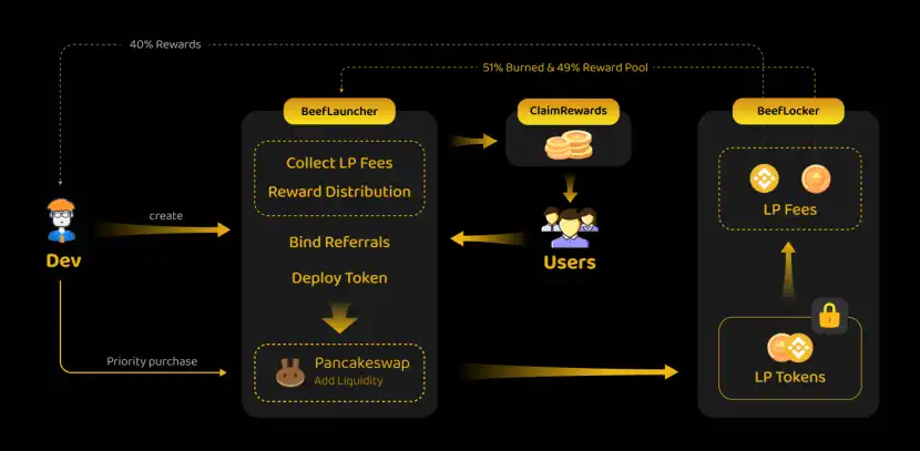 为确保平台及发射项目的可持续发展,Beef 将 Token LP Fees 中的 $BNB 收益部分,40% 永久归属于 Dev。这一激励机制鼓励 Dev 长期深度参与社区建设与项目发展,保障生态的稳步增长。