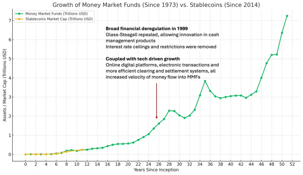 稳定币令人兴奋,美国即将出台的稳定币立法代表了一次千载难逢的机会,能够升级现有的金融体系。研究金融历史的人会看到它与大约半个世纪前货币市场基金的发明与发展之间的相似之处。