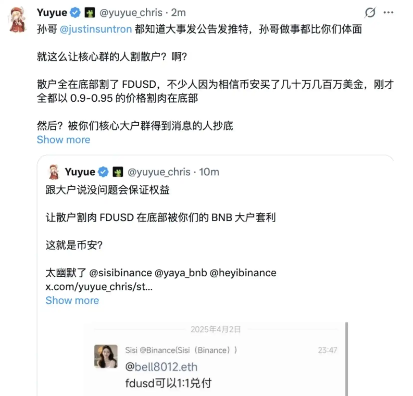 而如前文提到的,社区也有很多用户质疑 Binance 为什么在 FDUSD 跌至 0.9 美元以下才出来在社交媒体公开澄清 FDUSD 事件。称其就是想让散户在底部割肉,同时交易所大户抄底。