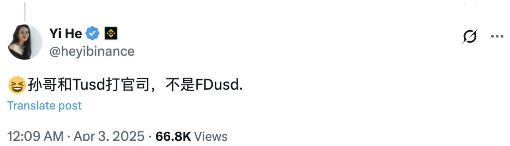 随后 Binance 联创何一也在 X 上发文表示:「该事件是因为 Justin Sun 和 TUSD 打官司,不是 FDUSD。」