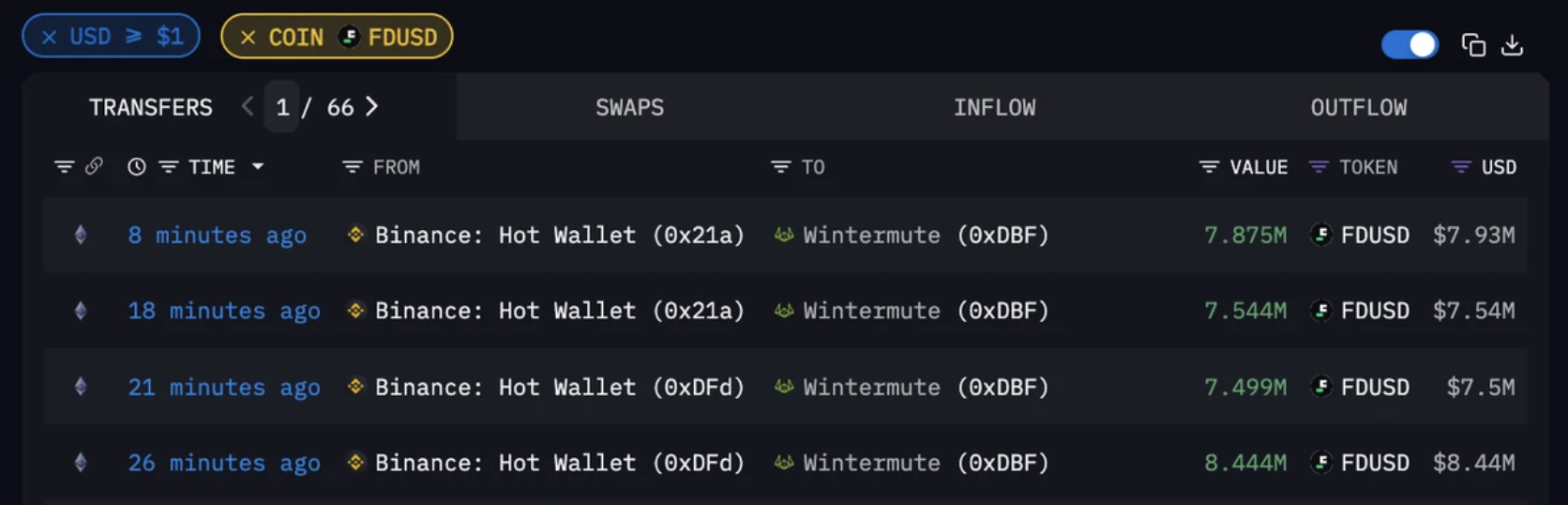 而在大家都 FUD FDUSD 之际,出现了一个小插曲,Wintermute 反其道行之,链上分析师 Ai 姨监测,在 Justin Sun 发文后的 20 分钟内,分 4 次共从 Binance 提出了 3136 万枚 FDUSD,一举成为除 Binance 外 FDUSD 最大持仓实体,持有约 6546 万枚代币,占总流通量的约 2.5%。