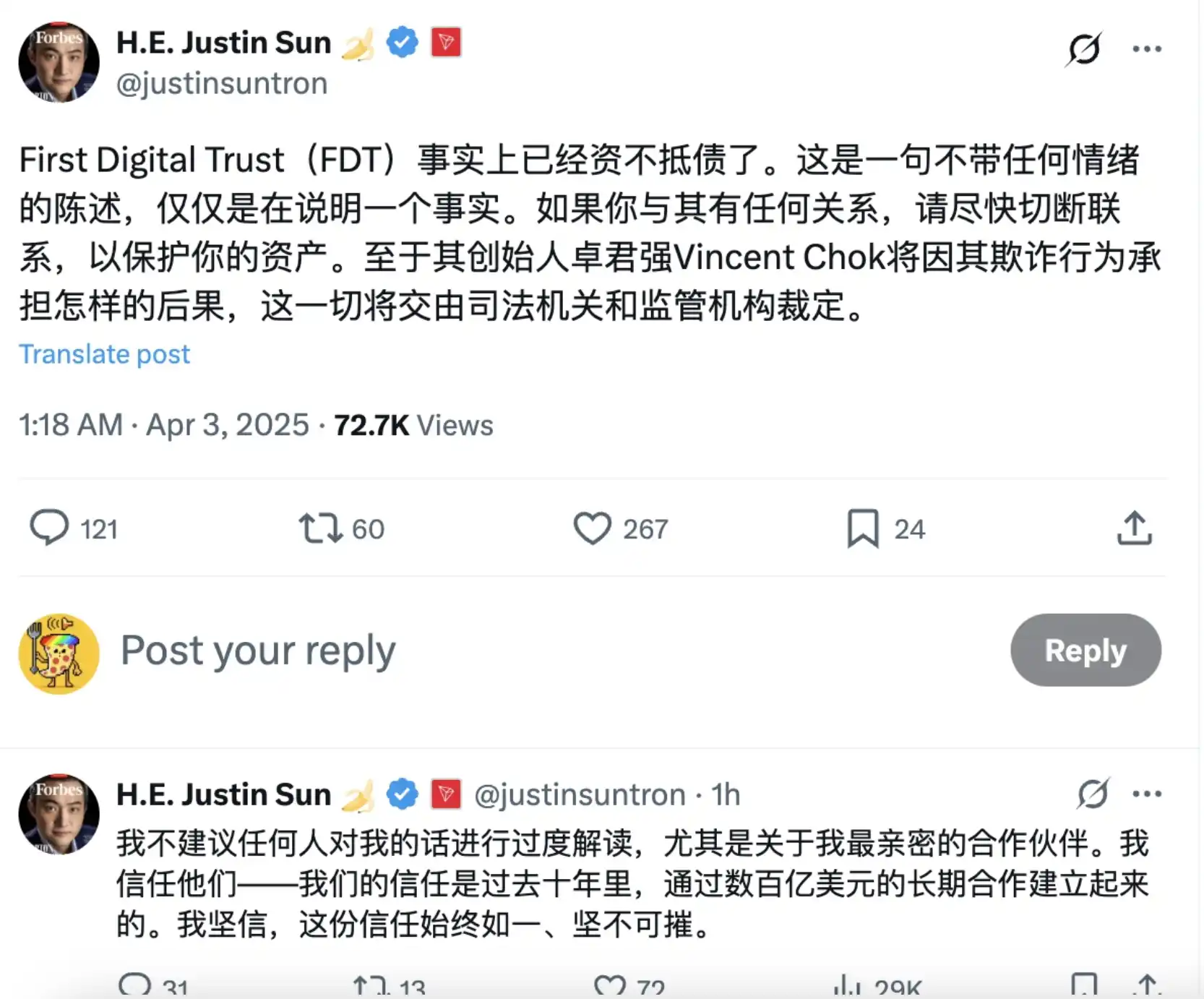 Justin Sun 深夜发文控诉 FDUSD 发行方 First Digital Trust(FDT)资不抵债