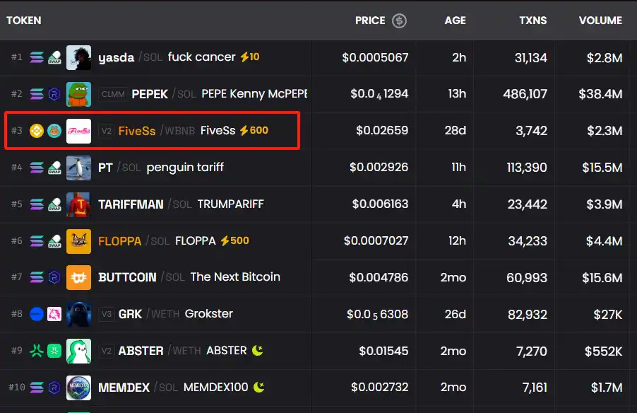 直播 PK 活动期间,FiveSs 上升至 DEX Screener 榜单第三名,展现了该 AI Agent 代币的短期爆发活力和长期发展潜力。