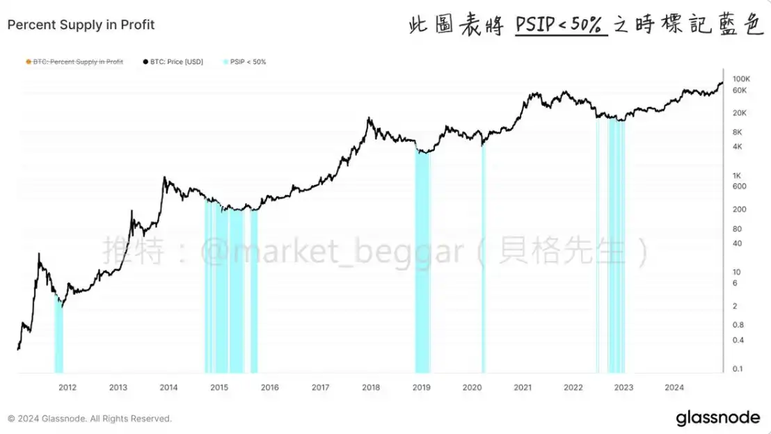 如下图所示,历史上 $BTC 在 PSIP < 50% 的时间点被标注出来,可以看出抄底时机还是非常精准的