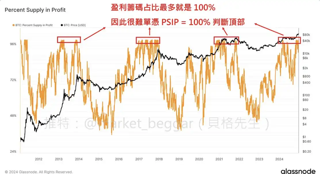 如下图所示,盈利筹码占比最高值是 100%,因此仅凭高 PSIP 很难直接判断顶部。