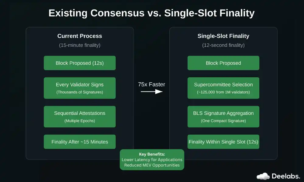 除了 L2 方案外,以太坊在 2023 年 9 月提出了一种改进共识机制的新思路——SSF(Single-Slot Finality,单槽最终性)。该方案结合了 BLS(Boneh-Lynn-Shacham)签名和超级委员会(Supercommittees),旨在实现 75 倍的最终确认速度提升,将交易确认时间从当前的 15 分钟缩短至 单个 12 秒时隙。