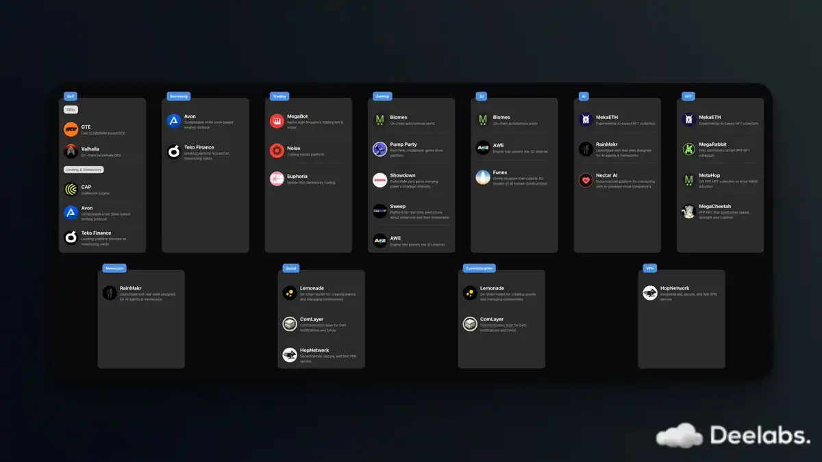 MegaETH 通过精准且精心设计的策略,成功吸引了多个高质量项目。其生态涵盖多个领域,包括 交易平台、DeFi 解决方案、游戏、娱乐 等。