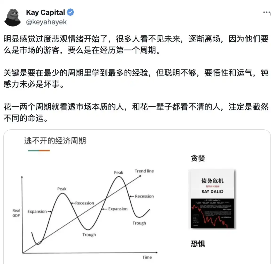 知名加密博主 @keyahayek 如此评价周期的力量:「花一两个周期便能看透市场本质的人,和用一辈子都看不清市场的人,注定拥有截然不同的命运。」