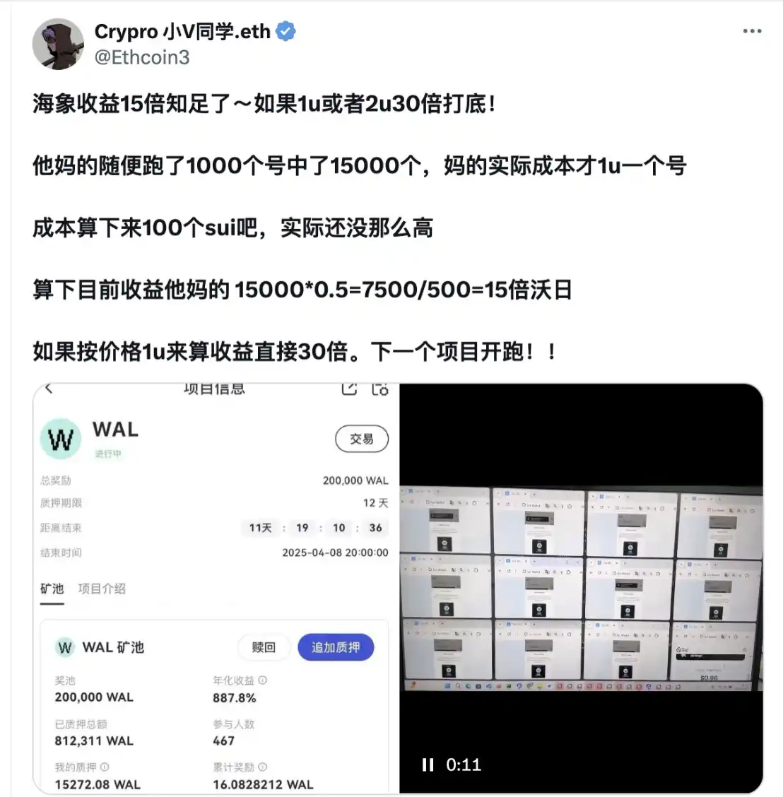 @WalrusProtocol 是 Sui Network 官方确认的空投项目。在 3 月 28 日币安宣布上线合约后,它毫无疑问地成为了一季度最耀眼的空投明星。Walrus 的空投标准十分简单,即便只是最基础的「低保号」,只需存入最低 0.1 Sui,就能获得约 15 倍的收益。