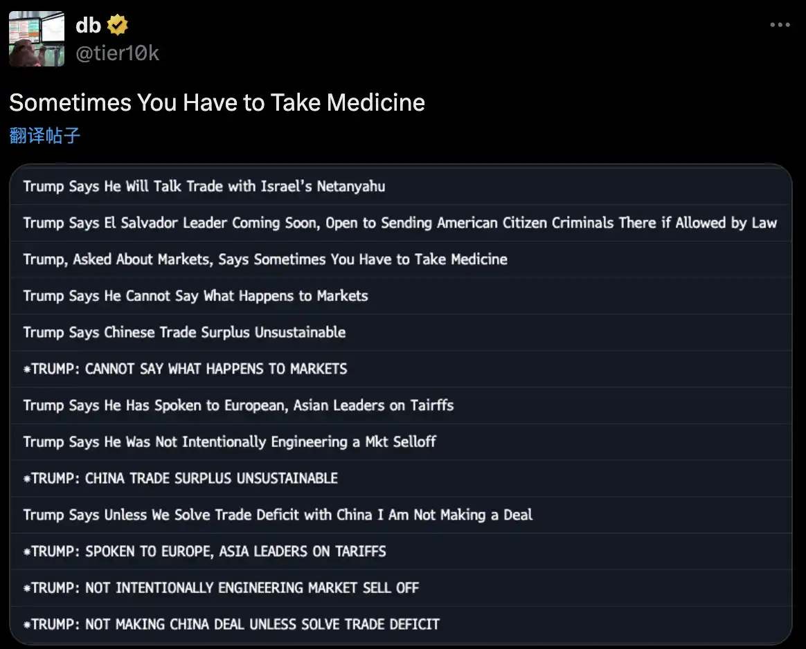 财政部长贝森特称「我目前给每个国家的建议是,不要报复、不要采取行动,观察形势,看看情况会如何发展。因为如果你报复,局势就会升级。如果你不报复,那么现在的情况就是上限了。」