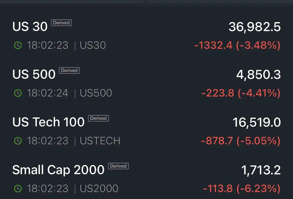 有专业人士指出纳斯达克 100 指数期货下跌 6.07%,S&P 500 指数期货下跌 5.97%,如果这一情况属实,那么这将是自 1987 年「黑色星期一」以来市场表现最糟糕的三天,甚至新冠疫情时期都没有如此糟糕。
