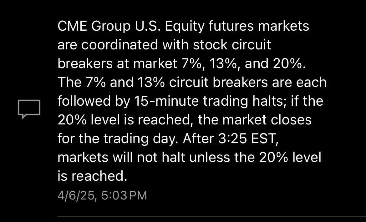 而因美国股市期货连续 3 天跌幅超过 -15%,在昨日经纪公司已经发出熔断警告,芝加哥商业交易期货市场设有 7%、13% 和 20% 的熔断机制。7% 和 13% 的熔断将各触发 15 分钟的交易暂停;如果达到 20% 的水平,市场将全天关闭。据《每日邮报》报道,由于特朗普总统的关税措施引发的市场崩盘,对冲基金正面临雷曼式的追加保证金要求。