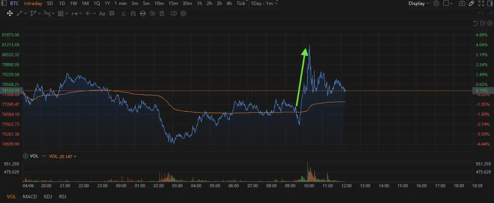 4 月 7 日,时间正值美国股市连跌三天的低迷时刻。美国东部时间上午 10 点 10 分,一条传言突然冒出:白宫正在考虑「暂停 90 天关税」。消息一出,市场瞬间躁动。仅仅 5 分钟后,10 点 15 分,CNBC 报道称,特朗普正考虑对除中国以外的所有国家实施为期 90 天的关税暂停。这一爆炸性新闻让投资者热血沸腾。到了 10 点 18 分,标普 500 指数从低点飙升,市值暴增超过 3 万亿美元,市场仿佛嗅到了久违的牛市气息,投资者纷纷猜测这是特朗普政策转向的信号。同时,比特币从 76000 美元在短短 10 分钟时间内,上涨至 81000 美元。市场做多情绪非常一致,导致 1 小时内合约空单爆仓超 1.29 亿美金。