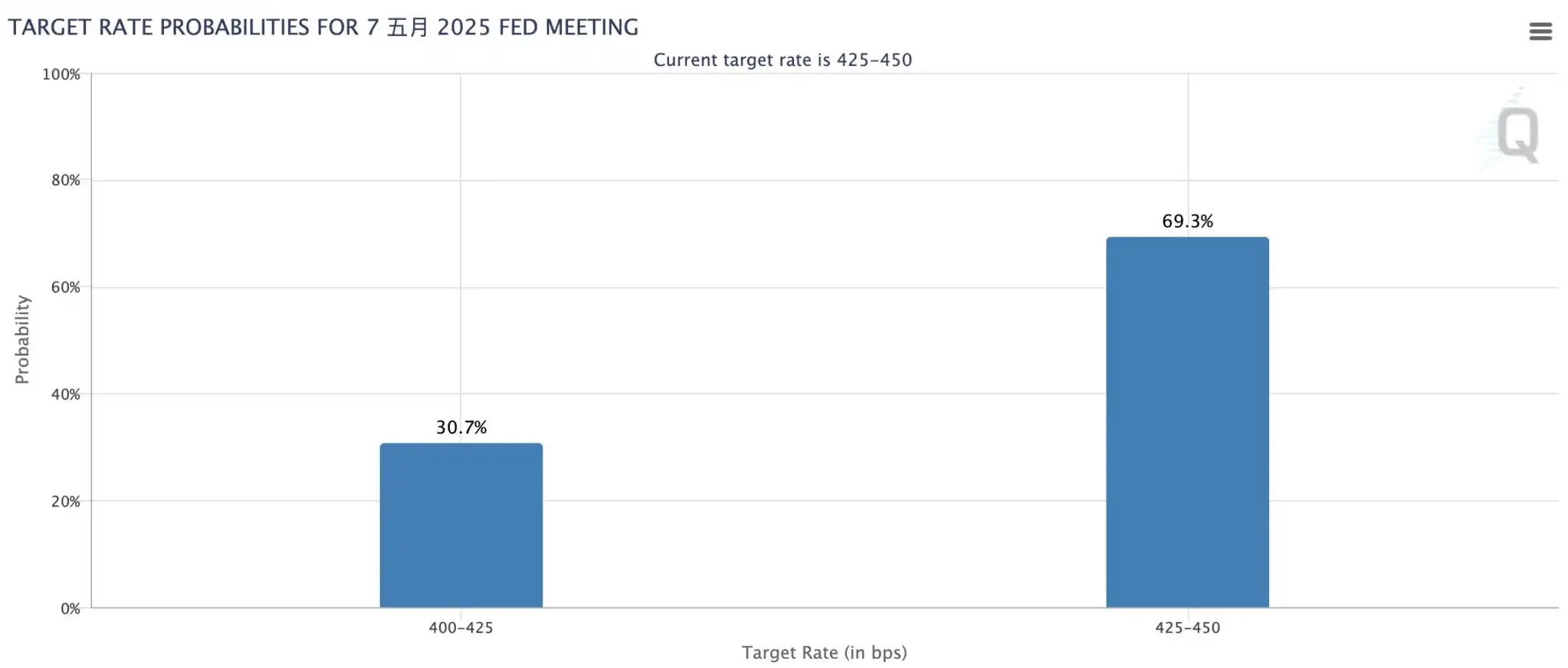 根据芝加哥商品交易平台(CME)的 FedWatch 工具显示,市场交易员目前预期联准会最快将在 5 月份降息的可能性,已从一周前的 14% 升至 30.7%。这反映出在贸易战阴影与潜在经济放缓的忧虑下,市场强烈预期联准会将采取更鸽派立场以支撑经济。
