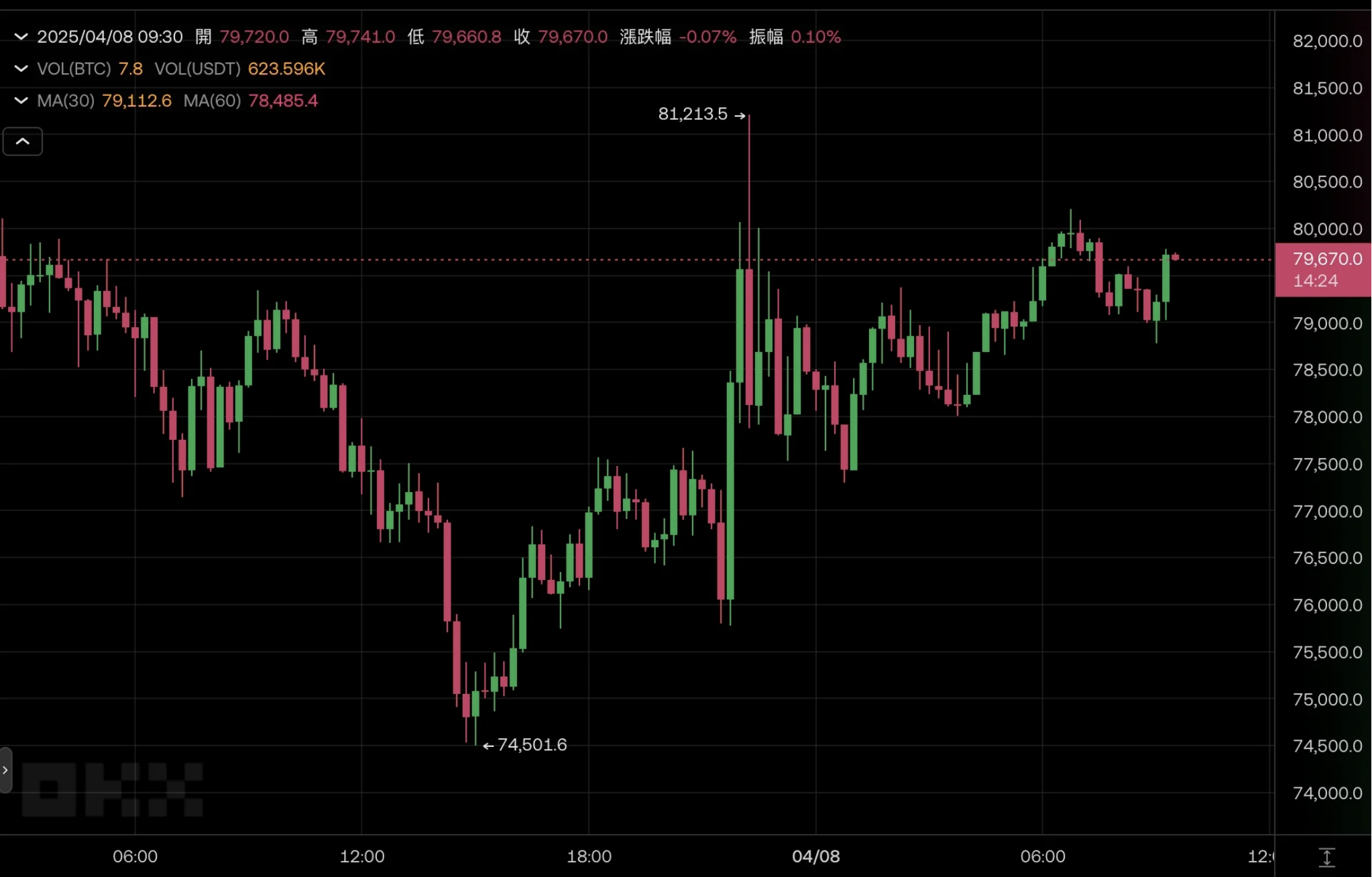 加密货币市场表现昨晚也受川普暂停关税假消息波动,比特币最高来到 81,213 美元,但白宫澄清后很快回落。截至台北时间 4 月 8 日九点半,比特币价格约为 79,670 美元,以太坊价格约为 1,574 美元,反弹能否持续仍待观察。