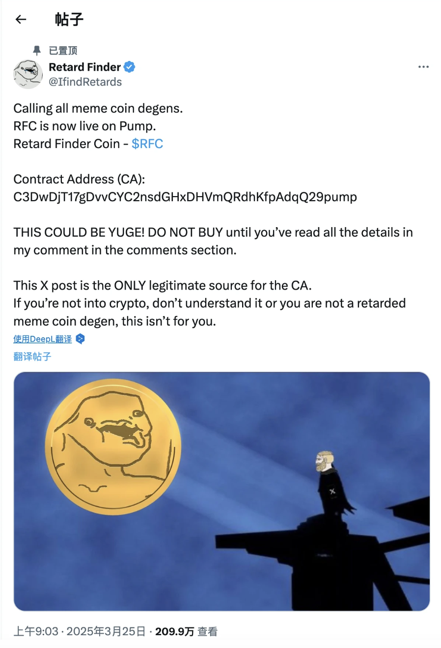 3 月 7 日,当整个加密市场沉浸在暴跌的悲伤行情时,一个名为「RFC」(Retard Finder Coin)的马斯克概念 Meme 项目逆势拉盘。根据 GMGN 数据,RFG 在过去 48 小时内价格飙升超过 200%,市值最高逼近 3000 万美元。