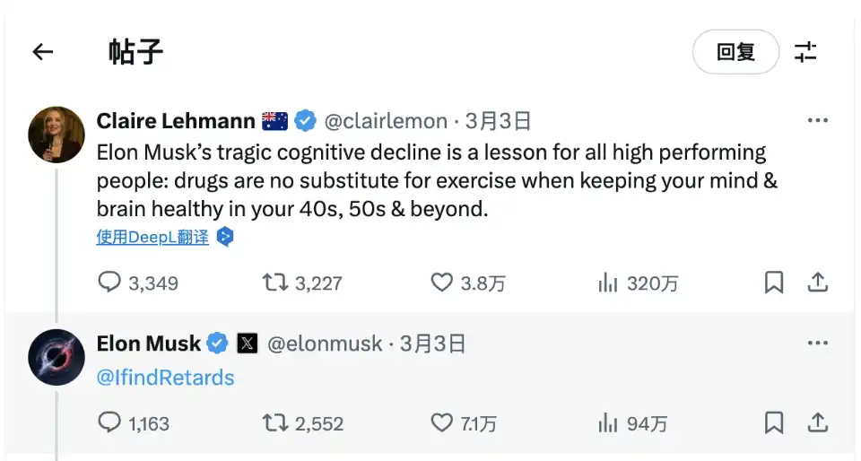 2025 年 3 月,马斯克曾在 X 上回复一则批评他「认知能力下降」的帖子时,直接 @ 了该账号。此前,Quillette 创始人 Claire Lehmann 曾发帖称马斯克依赖药物而非锻炼来保持头脑清醒,马斯克则以轻描淡写的方式 @IfindRetards,仿佛在暗示「我找到了一个蠢货」。这一互动不仅让该账号曝光量激增,也被视为马斯克对其「troll 文化」的默许和认可。