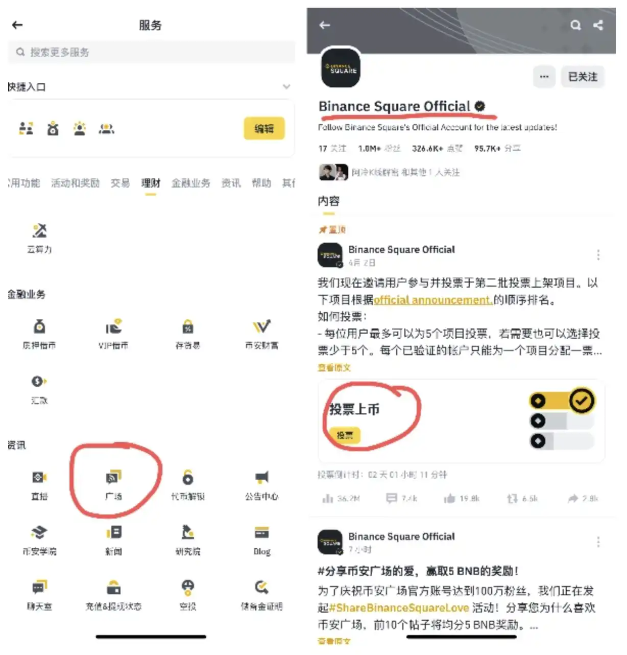 只要满足至少持有 0.01 枚 BNB 条件的真实用户即可,具体参与投票流程很简单,首先在 Binance「资讯」栏目下找到「广场」,其次找到 Binance Square Official 账户并在置顶内容中找到「投票」,最后在第二期候选的 12 个项目中选择个人喜欢项目进行投票即可,具体操作过程如下图。