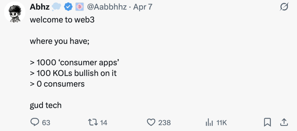 内容翻译:欢迎来到 Web3!在这里你会看到:1000 个「消费应用」、100 个看好它的 KOL 和 0 个消费者