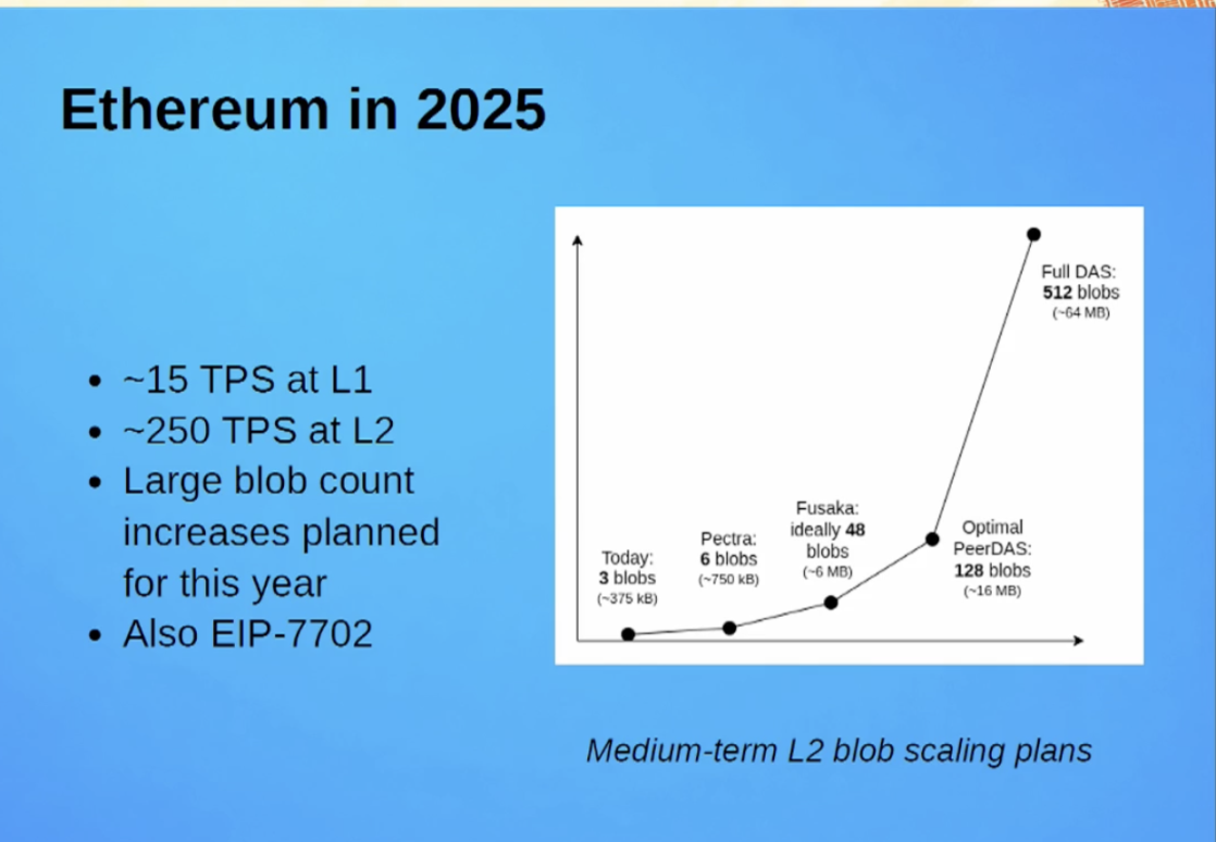 即将到来的 Pectra 升级将把 Blob 容量从 3 个增加至 6 个。当前,3 个 Blob 约为 375kb,每 12 秒产生 375 kb 数据,即每秒约 20kb,对应 TPS 约为 250;若 Blob 容量增至 6 个,TPS 有望提升至 500。不过,Blob 容量的扩展在很大程度上依赖于今年三季度或四季度将实现的 Fusaka 升级。在理想情况下,Fusaka 升级可将 Blob 容量提升至 48;若最终完整实现 DAS,Blob 容可高达 512,届时以太坊 L2 的 TPS 甚至可能提升至数万次。