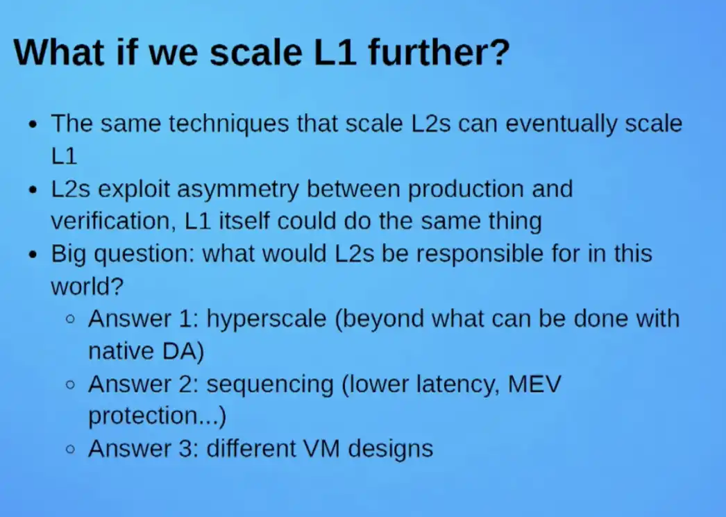 应用于 L2 的扩展技术,未来同样可用于 L1 的扩展;L2 利用了生产和验证之间的不对称性,L1 本身也能够借鉴这一思路;那么,在这样的世界中,L2 将承担哪些职责?1、超大规模(hyperscale,超越原生 DA 所能达到的水平);2、排序(更低的延迟,MEV 保护……)3、不同的虚拟机(VM)设计。
