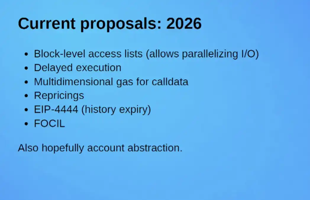 区块级别访问列表(允许并行化 I/O);延迟执行;多维 calldata Gas;重新定价;EIP-4444(历史数据过期):不再要求每个以太坊节点都存储以太坊历史记录,而是使用点对点网络,并且可以以更分布的方式存储历史数据;FOCIL。
