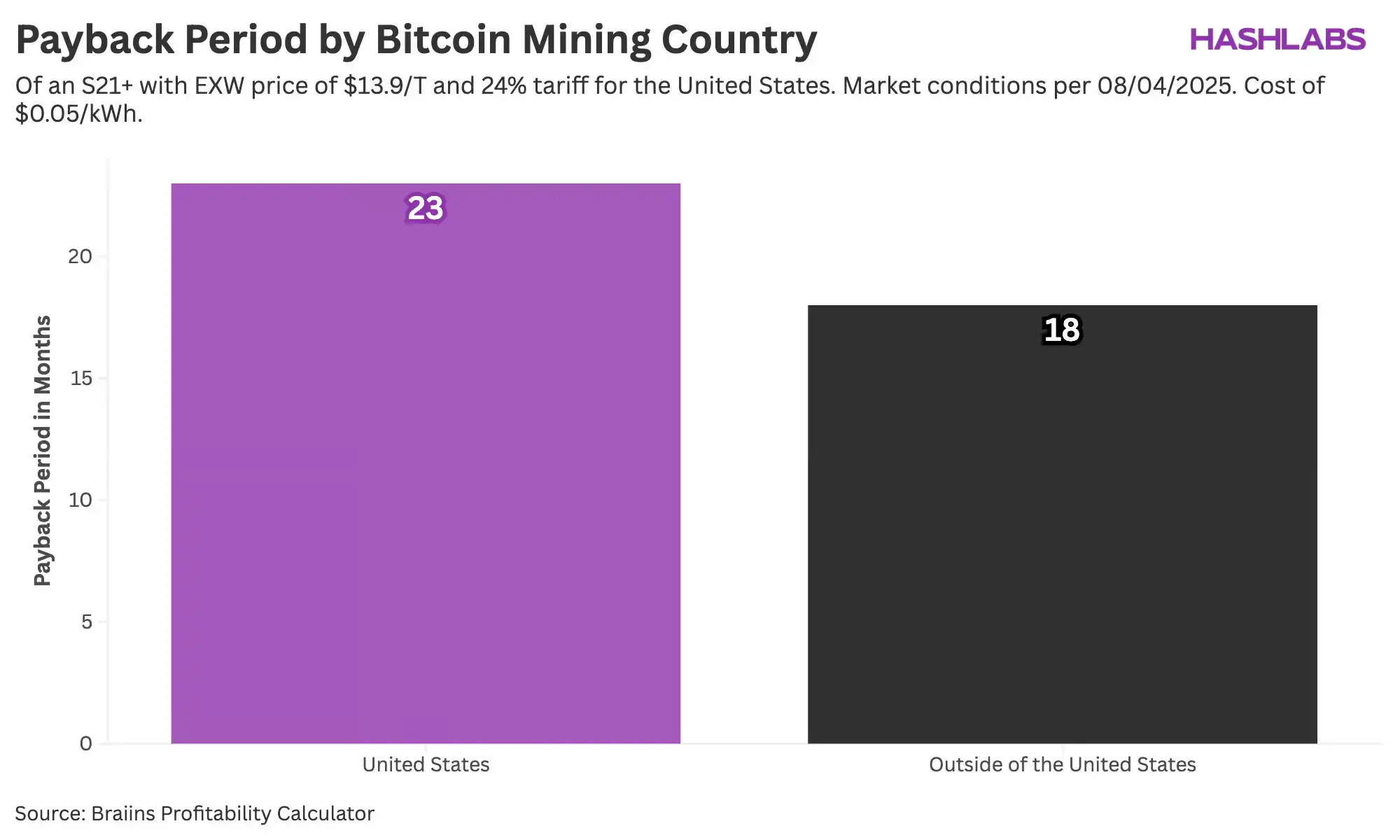 下图展示了在美国和一个不受关税影响的国家部署 Antminer S21+ 的预计回本周期。如数据所示,在美国为同一台矿机多支付 24% 的费用将显著延长回本周期——这削弱了在美国进行挖矿的核心经济依据。