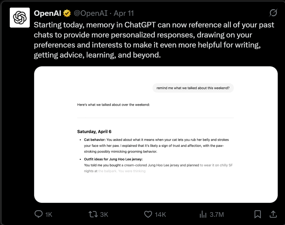 这种担忧变得更重要,是因为 @OpenAI 最近更新了 ChatGPT 的「记忆」功能——它现在可以回顾你所有的对话,以提供更个性化的回答。这就意味着,你和 AI 说的所有内容,AI 都记得,并且可以反复引用。