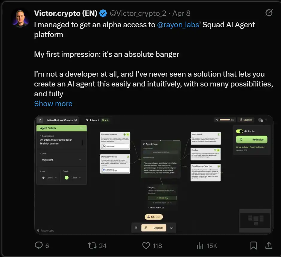 Rayon 有很多很酷的子网(最酷的可能是 Gradients,这是一个 autoML 平台,你可以在上面轻松训练模型),而更酷的是他们最新的旗舰产品——Squad AI Agent 平台,你可以通过拖拽模块的方式(类似节点构建器的风格,比如说 @figma 那样)来创建一个智能体。