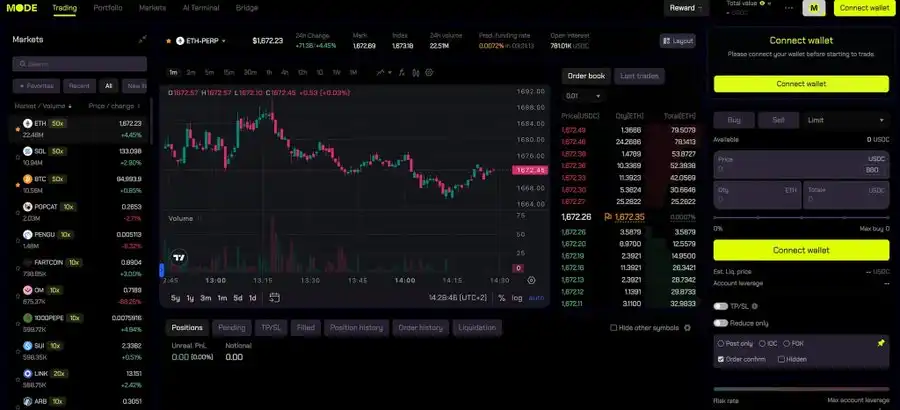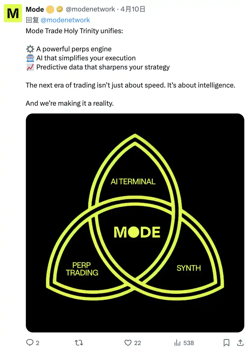 Mode Trade 圣三位一体整合了:强大的永续合约引擎、简化执行的 AI、提升策略的预测数据 下一代交易不仅仅关乎速度,而是智能