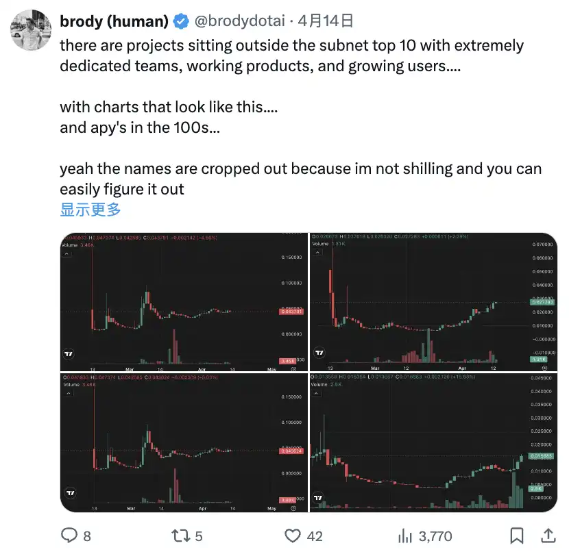 有些项目不在子网前十名,但拥有极其专注的团队、运作的产品和不断增长的用户。图表看起来年化收益率高达数百倍
