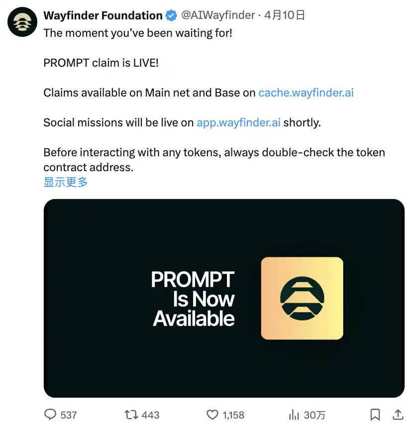 PROMPT 申领现已上线,主网和 Base 上可申领,社交任务即将上线。