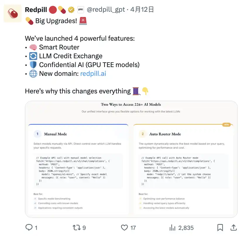 我们推出了 4 个强大功能:智能路由器、LLM 信用交易所、保密 AI(GPU TEE 模型)、新域名