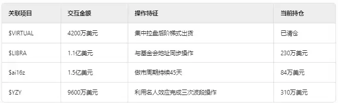 同时还在 $LIBRA 和 $VIRTUAL 上进行过活动,这两个币也是公认的超级强庄币,更不用说 $LIBRA 深陷整个基金会幕后的操纵丑闻(虽然现在已经没有多少人重提)。