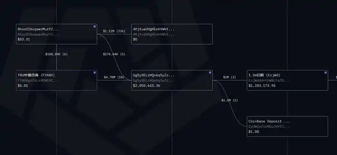1、上游资金池:1 亿美元 USDC 来自某 TRUMP 做市商地址,通过 Gg5yX... 中转