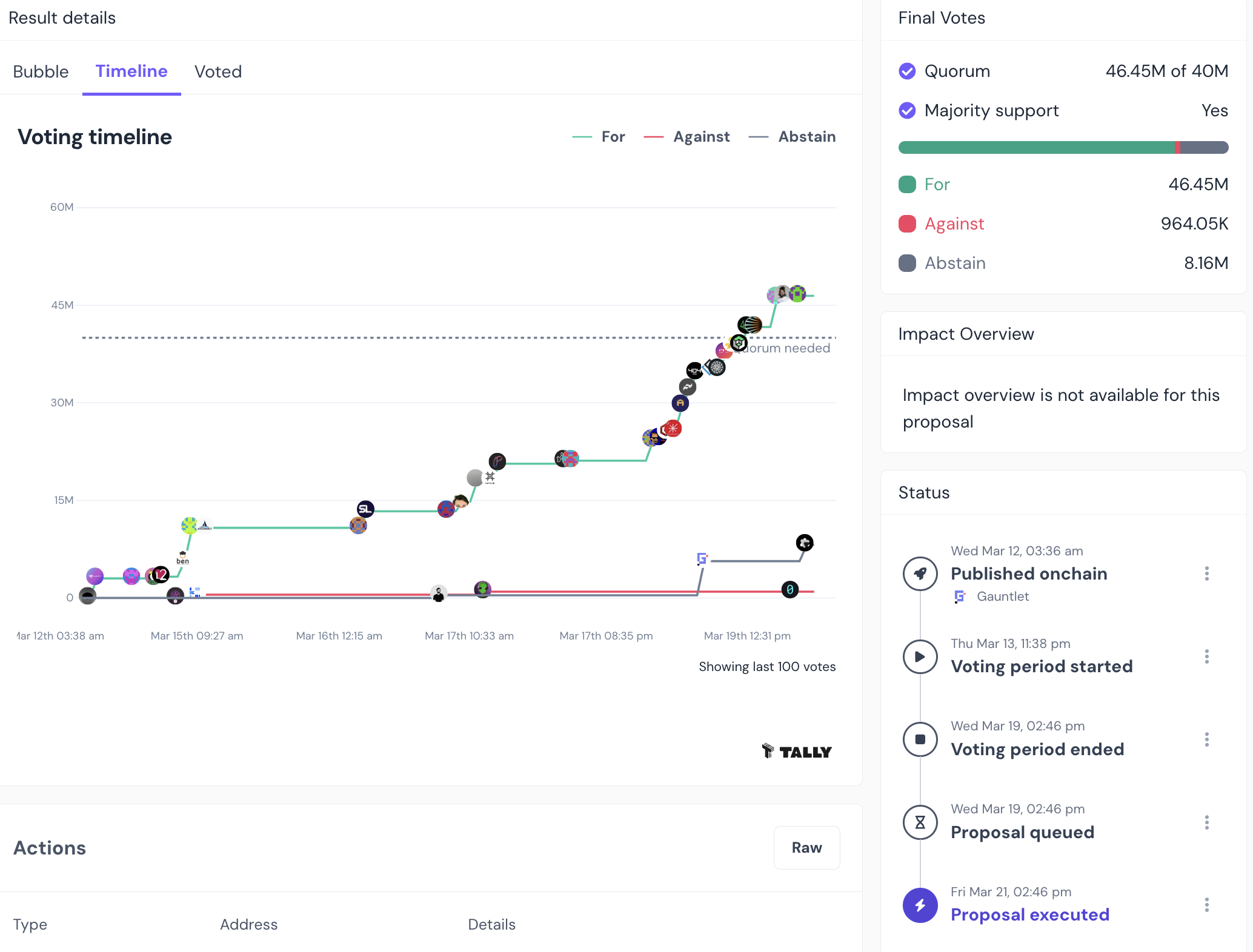 在 2025 年 2 月 14 日 Uniswap 基金会的执行董事兼联合创始人 Devin Walsh 在 Uniswap 治理 DAO 中发起关于 Uniswap v4 以及 Unichain 的流动性激励提案,该提案在 3 月 3 日在 Snapshot 上通过 Temp Check 后,最终于 3 月 21 日在 tally 正式完成最终提案,共 5300 万枚 UNI、468 个地址参与投票。该计划的技术支援 Gauntlet 宣布该计划的首期活动将持续 2 周,并于 4 月 15 日开启。
