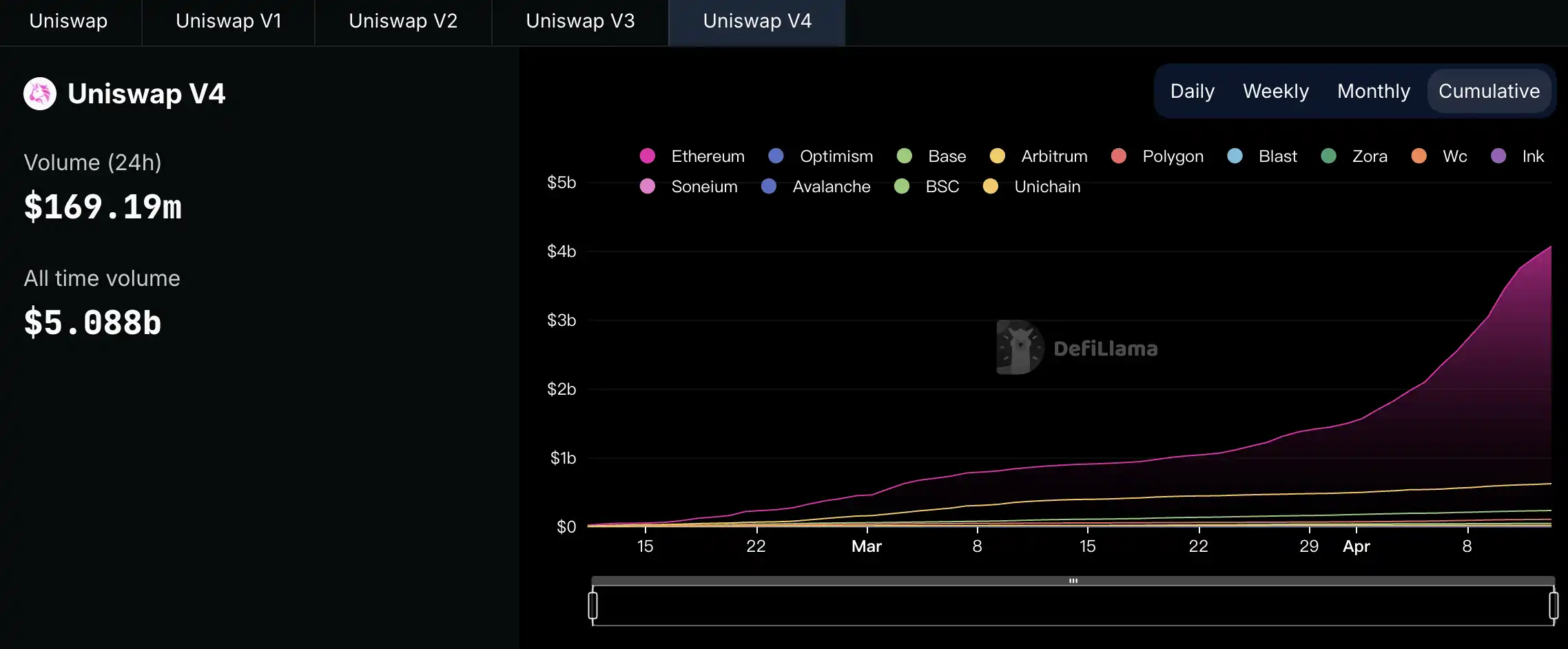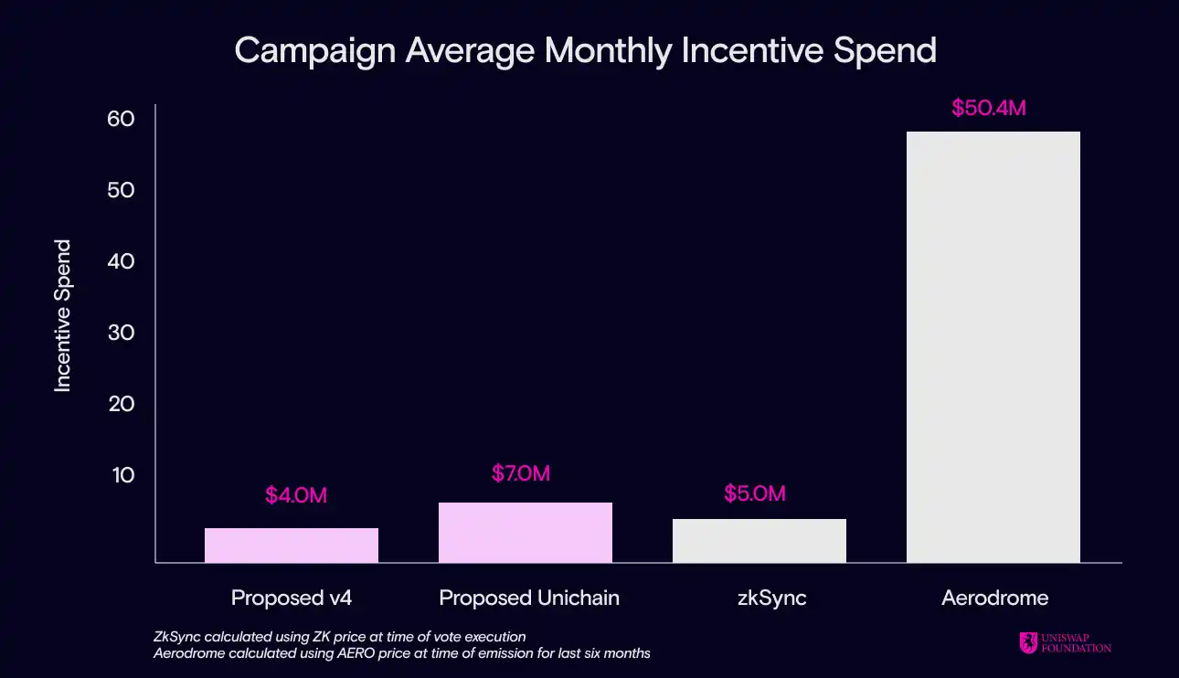 该提案同时包含对 UniSwap v4 未来六个月以及 Unichain 未来一年的计划,基金会针对 Uniswap v4 的目标是在未来六个月要将 v3 上 328 亿美元的 30 天滚动交易量迁移到目标链上的 v4,为该六个月的计划共申请了 2400 万美元的预算。