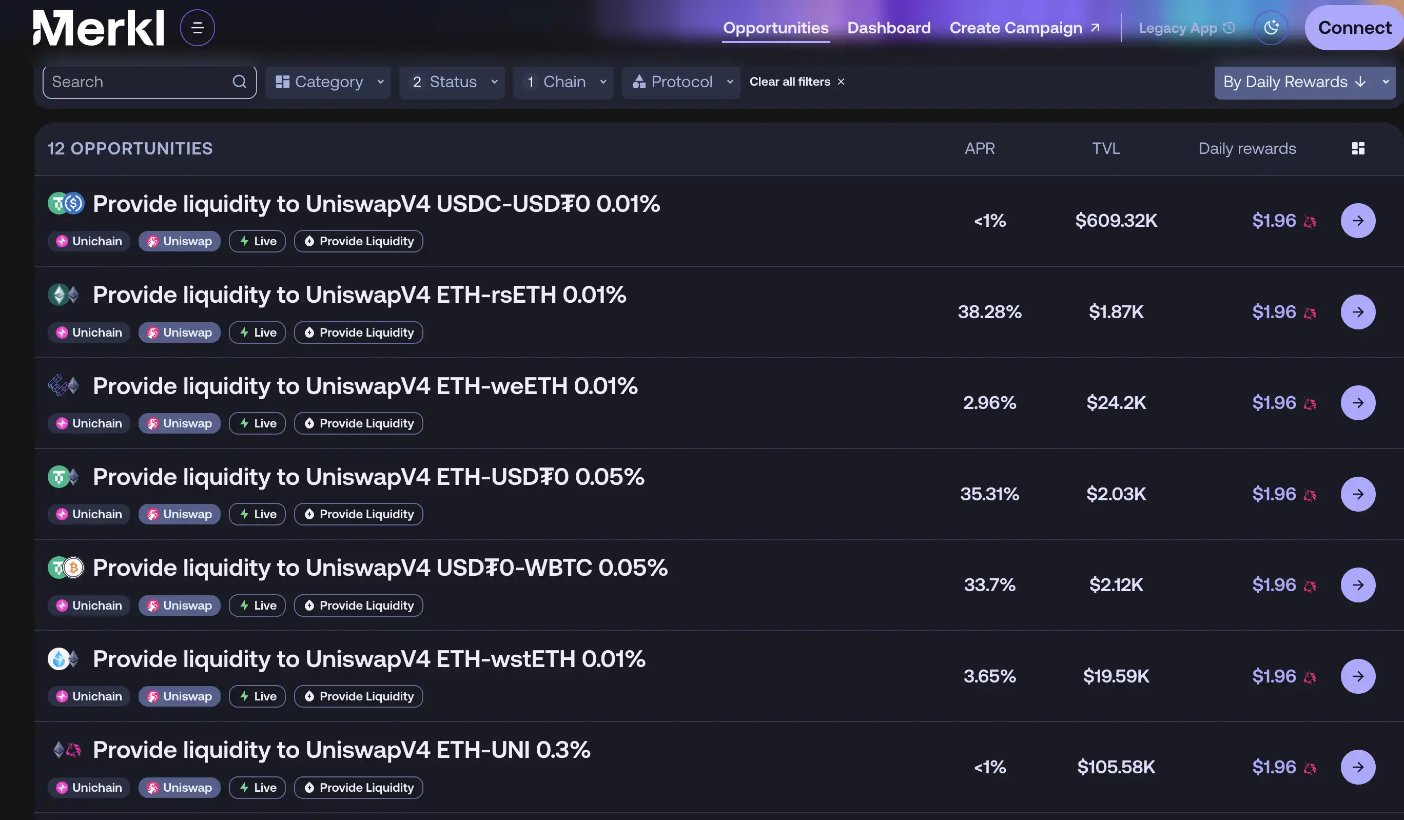 进入Merkl查看激励池,这些激励机制可能会随着时间的推移而增加或减少,如果想要高效的挖$UNI 的话,需要随时关注 12 个池子的奖励变化。