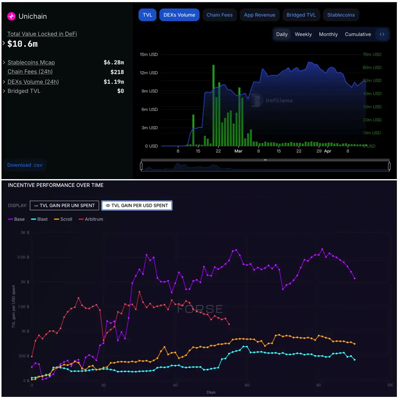 虽然类比数据不够完善,但是能够代表一定的比例范围区间,若要用 700 万美元在三个月内将 Unichain 的 TVL 提升至 7.5 亿美元,需要提升周边基础设施完善度以及用户水平至与 base 相似,而其中表现最差的 Blast 链目前的 TVL 还是 Unichain 的 10 倍以上。
