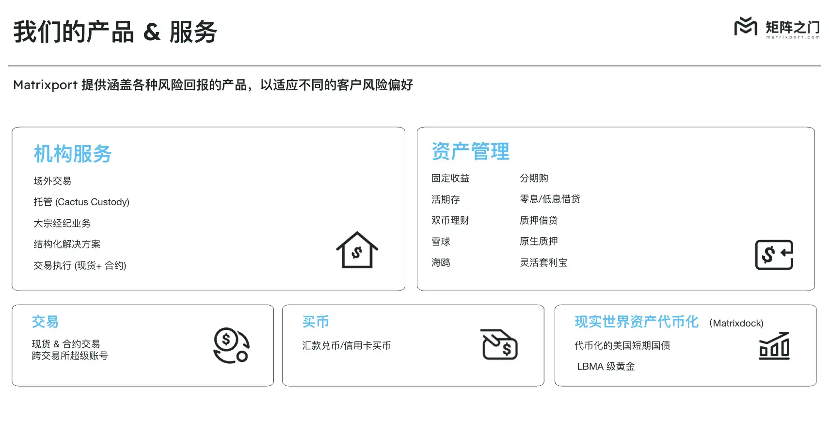 在产品矩阵构建方面,Matrixport 不断推陈出新,逐步推出了一系列能满足不同人群,不同风险偏好的的全产品体系。