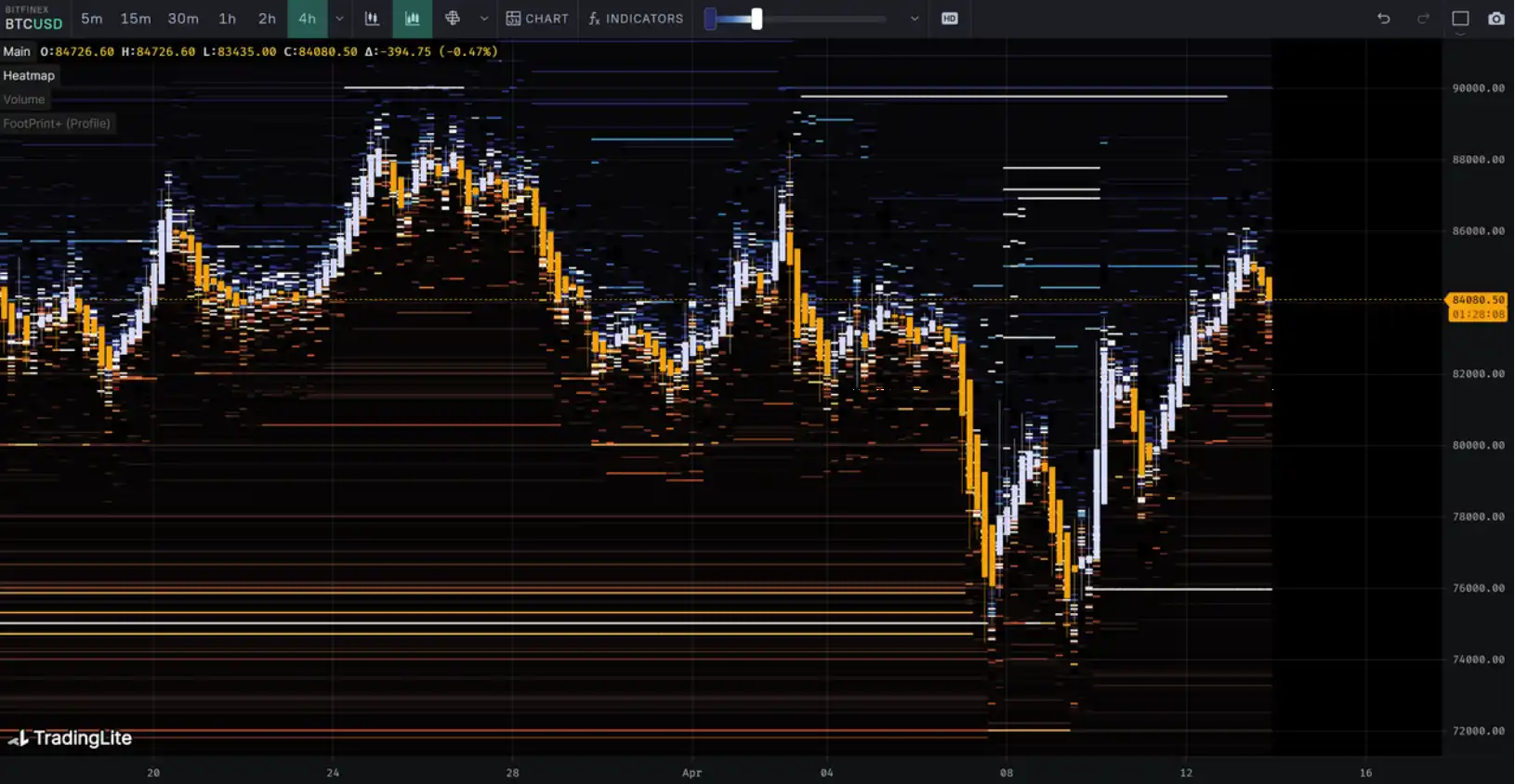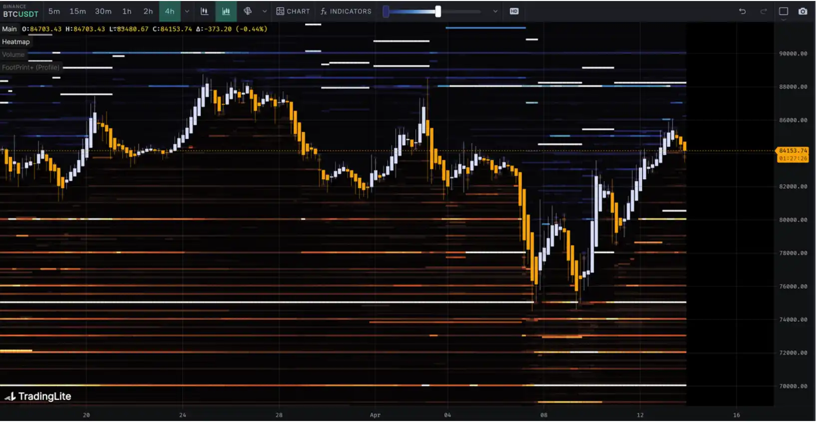 观察筹码分布图,在约 80000 附近有⼤量筹码成交,将有⼀定的⽀撑或压⼒。