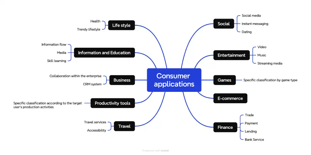 通常情况下,按照大多数 App Store 中的分类,我们可以将整个消费者应用赛道大致分为以下 10 个类别,并且每个类别又会有不同的细分。当然随着市场的成熟,很多新型产品为找到各自的差异性卖点,都会在一定程度上组合多个特征,不过我们仍可以按照各自的核心卖点做简单的归类。