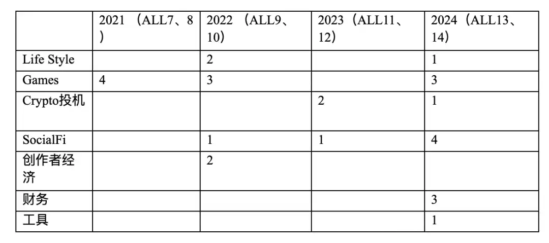 从投资偏好的发展趋势来看,Alliance DAO 从 2021 年开始对 Consumer 类项目的投资与孵化,在 2021~2023 上半年,其主要投资与孵化方向侧重于 Games 和创作者经济类项目。自 2023 年下半年开始直到 2024 年,其偏好切换为 Crypto 投机类、SocialFi 类以及财务类。