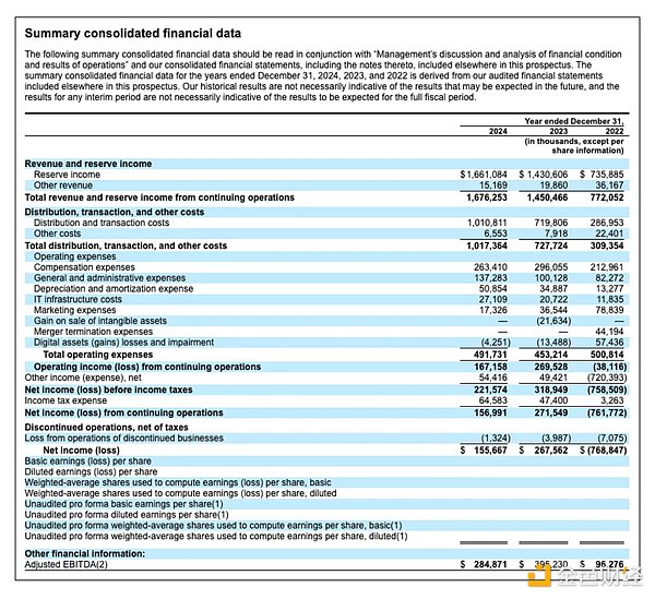 对于每发行一美元的 USDC,Circle 都会将支持储备投资于一系列高流动性、低风险资产,如短期美国国债和现金存款。这种结构使 Circle 能够在确保 USDC 持有者流动性和赎回稳定性的同时,从储备金中获得收益。在其申请文件中,Circle 透露其在 2024 年获得了 16 亿美元的储备收入。这占其总收入的 99%,表明其收入结构高度集中于利率。