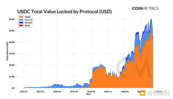 USDC 继续在 DeFi 借贷市场中发挥着基础性作用,超过 50 亿美元锁定在 Aave、Spark 和 Morpho 等协议中(代表已供应但未被借出的 USDC 部分)。对于像 Maker(现在是 Sky)这样的抵押债务协议,约 40 亿美元的 USDC 也通过其价格稳定模块支持 Dai/USDS 的发行。