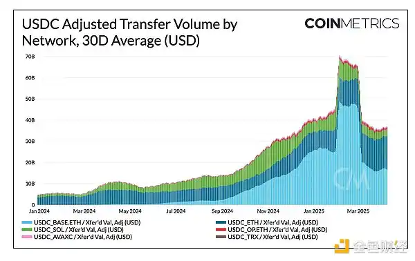 USDC 的流通速度和转移量也出现了令人瞩目的增长,30 天平均值达到约 400 亿美元。2025 年,大部分 USDC 转移量发生在 Base 和以太坊上,有时占调整后总转移量的 90%。